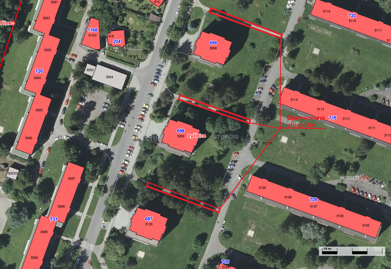 Stručný popis předmětu: Předmětem veřejné zakázky je oprava tří stávajících chodníků u bytových domů č. p. 697, 698 a 699 na ulicích spojujících ulice Beskydskou a páteřní komunikaci „nad Hradčany“ v k.ú. Lyžbice. V rámci stavby dojde k výměně obrubníků, podkladních vrstev a nového vydláždění zámkovou dlažbou.